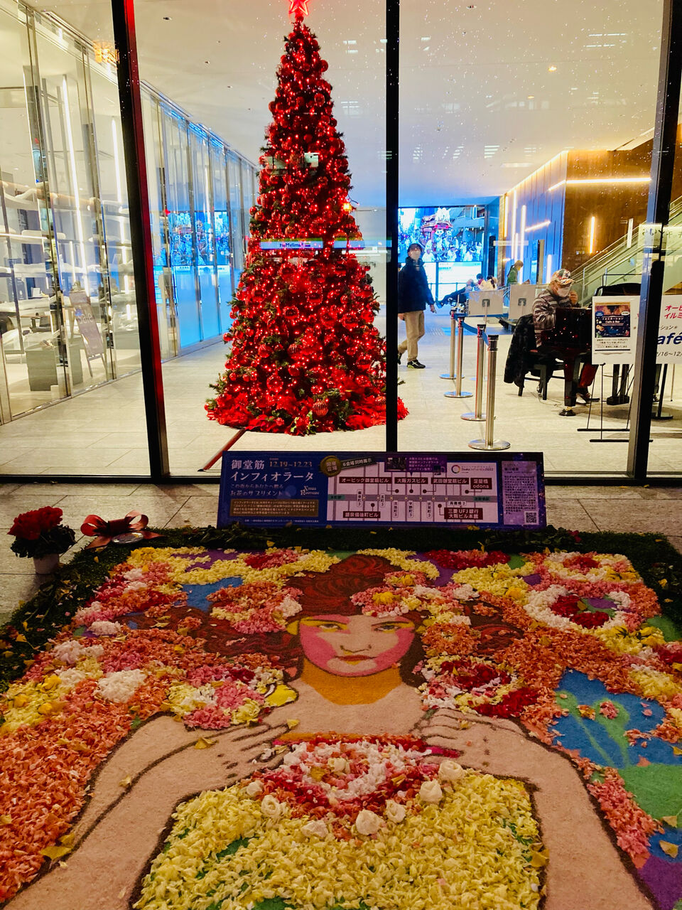 ガラスに御堂筋イルミが反射し
